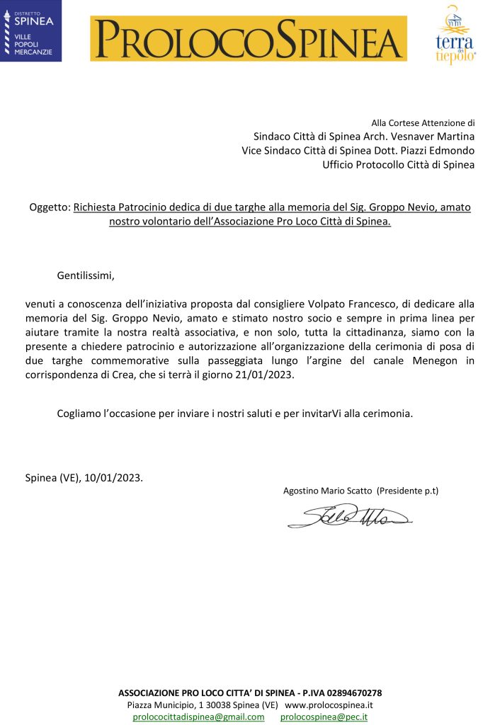Si ringrazia l’Amministrazione Comunale ed il consigliere Francesco Volpato per l’impegno e la sensibilità verso il caro Nevio