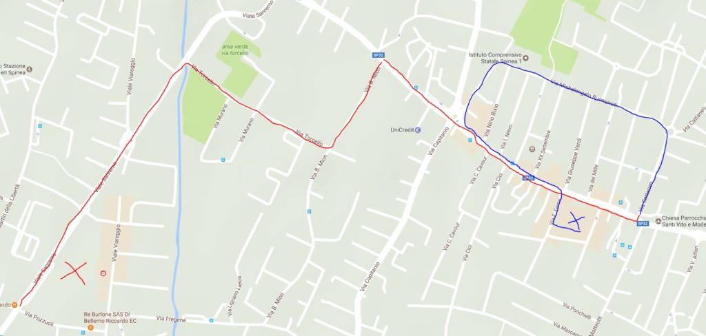 Vi proponiamo la mappa sintetica con il percorso che si svolgerà in due fasi, dalla partenza al Villaggio di Fiori fino alla chiesa di SS Vito e Modesto (in rosso), proseguo poi all’interno del quartiere Rosselli con l’immissione nuovamente in via Roma e la conclusione in piazza E. Fermi (in blu)